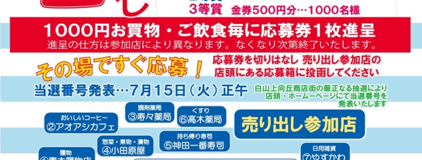 お知らせ, 売り出し2025年 中元セール宝くじのお知らせ白山上向丘商店街にて、中元セール宝くじが6月下旬から開始されます。1000円のお買い物・ご飲食ごとに応募券1枚を進呈します。特賞の金券3万円分をはじめとして総勢1062名様に金券があたります。ふるってご参加ください。 【宝くじ概要】 期間:2025年6月26日(木)-7月10日(木) 当選番号発表日:7月15日(火) 2025-06-23 https://hakusan.tokyo/wp-content/uploads/2025/06/chirashi_chugen2025.jpg 1350 1000 admin https://hakusan.tokyo/wp-content/uploads/2020/12/hakusan-logo001.svg admin2025-06-23 03:37:152025-06-23 03:37:352025年 中元セール宝くじのお知らせ